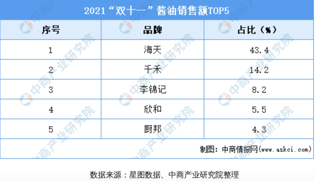 作为调味品行业龙头的海天味业,在国内市场中一直有着不可撼动的地位。根据相关数据显示,海天在去年双11期间,仍为酱油销量TOP1。在中国,海天酱油的市占率高达15%,而李锦记、美味鲜的市占率合起来才有6%,不足海天味业的一半。