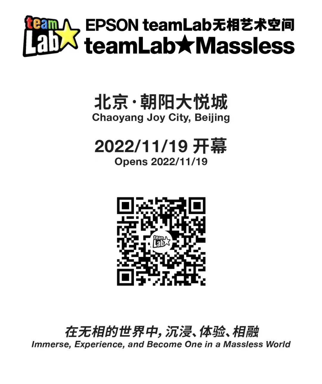 EPSON teamLab无相艺术空间预告视频 艺术团队teamLab打造的沉浸式美术馆“EPSON teamLab无相艺术空间: teamLab Massless Beijing”,将于2022年11月19日在北京朝阳大悦城顶层开幕。展馆挑高11米,总面积约10,000平方米,是teamLab最大规模的美术馆。10月11日起正式开始售票。