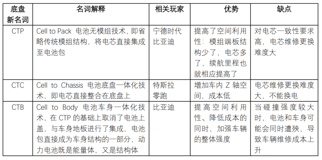CTC、CTP、CTB……在这场变革中,越来越多的底盘新名词涌现。我们先来了解一下,这些新名词到底是什么?为了方便大家理解,笔者做了一个表格:
