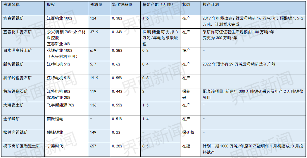 目前,宜春在产的锂云母矿主要有三处,分别为宜春钽铌矿、永兴材料的化山瓷石矿、飞宇新能源的大港瓷土矿;江特电机的茜坑锂瓷石矿处于探转采阶段;赣锋锂业的松树岗项目、宁德时代的枧下窝矿区陶瓷土矿尚未形成有效产能。