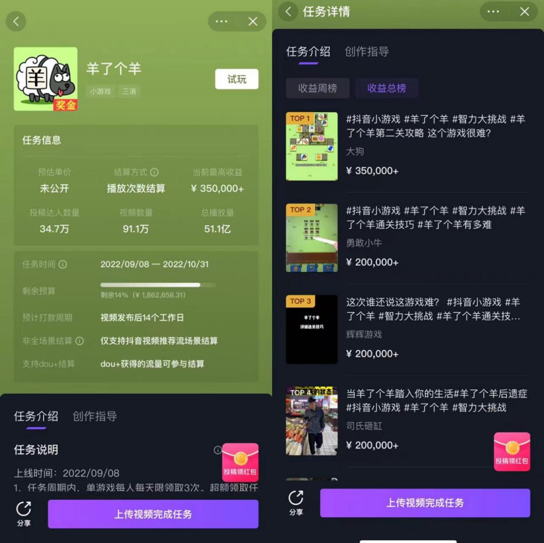 例如,小游戏《羊了个羊》在星图平台X“游戏发行人”计划联合发布的推广任务预算估计有500万元左右,在视频收益总榜中,多数内容围绕游戏攻略展开,当前收益最高的一条视频收入超过35万,该任务目前有34.7万人参与投稿,视频数量高达91万,视频内容总播放量超过51亿。