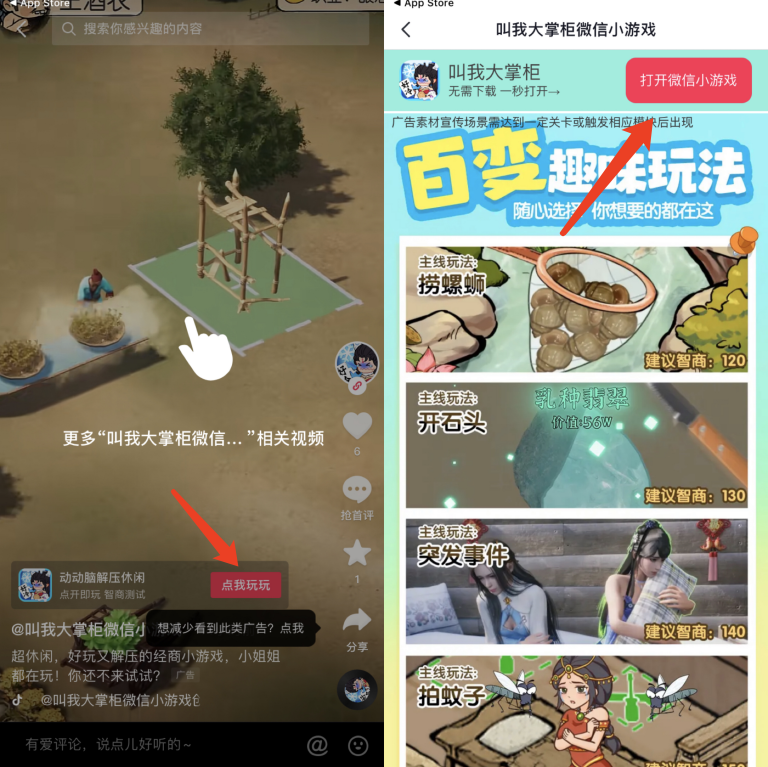 现在,很多微信小游戏也在抖音进行推广,抖音可以直接搜索并跳转的这类微信小游戏包括《叫我大掌柜》《我是大东家》《英雄盟约》《山海经异变》《异兽擎天》《别惹三国》《雄霸乱世》等。这种小游戏相对重度游戏来说是碎片化的,用户能在较短的时间内体验到打游戏的爽感,因此,小程序游戏同短视频一样具有解压、节奏快速、操作简单等特性,这与短视频内容属性适配度极高。作为竞争对手的微信来抖音买量,不论抖音小游戏发展如何,其游戏内容生态的价值已经被重视,而对字节来说游戏梦也许有了新的着力点。