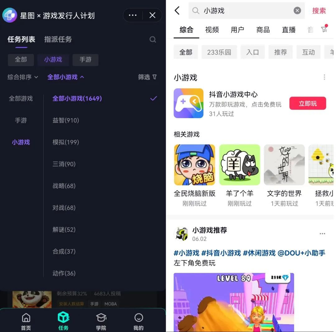 抖音游戏内容的重点仍在视频形式,以激励计划推动创作者产出视频,再借助视频完成游戏转化,就此抖音还相继推出全民任务、直播推广模式等,游戏宣发在抖音站内就完成了从内容到形式的迭代升级。