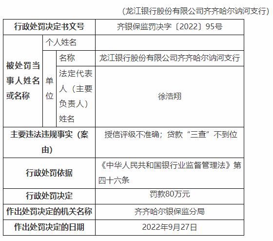 黑龙江银保监局披露行政处罚信息公开表。龙江银行股份有限公司齐齐哈尔讷河支行因授信评级不准确,贷款“三查”不到位,9月27日被齐齐哈尔银保监分局罚款80万元。