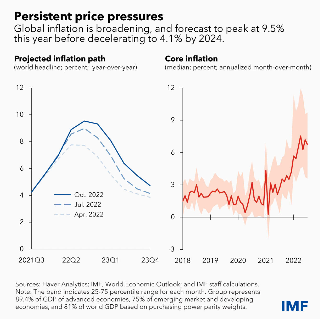 尽管经济放缓,通胀压力将比此前预期的更加广泛和持久。IMF预计,全球通胀水平将在今年达到9.5%的峰值,并在2024年回落至4.1%。“几乎所有地方,快速上涨的价格,尤其是食品和能源价格,给家庭,特别是贫困家庭带来了巨大的困难,”古林查斯表示。