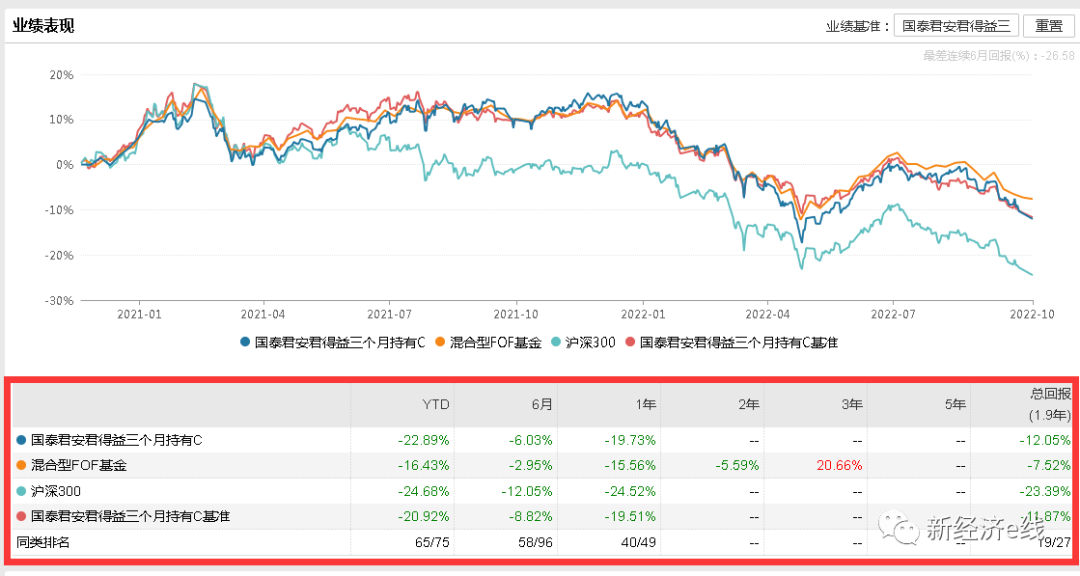 如同为券商系公募产品,国泰君安君得益三个月持有今年来业绩表现也大幅落后。该基金成立于2020年11月16日,其比较基准为,沪深300指数收益率*75%+中债综合(全价)指数收益率*25%。据悉,国泰君安君得益三个月持有期混合型基金中基金(FOF)集合资产管理计划于2022年3月21日起正式变更为国泰君安君得益三个月持有期混合型基金中基金(FOF)。