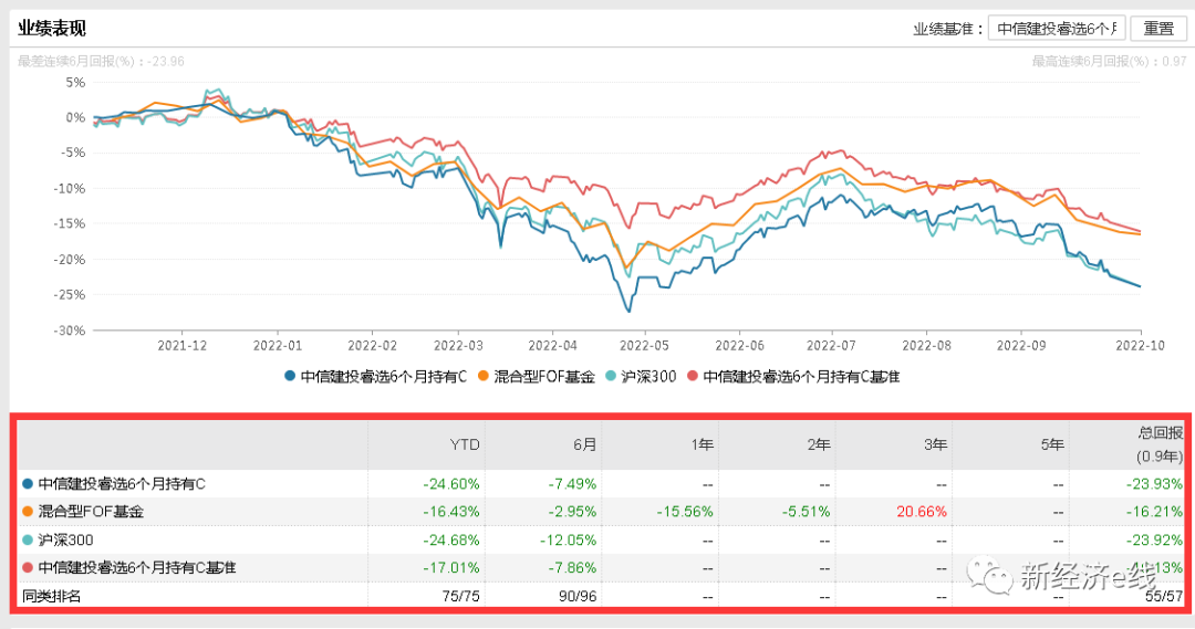 据新经济e线了解,尽管FOF产品由专业买手来操盘,但实际情况却是泥沙俱下。截至2022年10月10日,在偏股混合型FOF业绩排行榜上,中信建投睿选6个月持有C(013845)业绩垫底,今年来该基金以-24.60%的收益率位列倒数第一。紧随其后的是中信建投睿选6个月持有A(013844),年内收益率为-24.38%。
