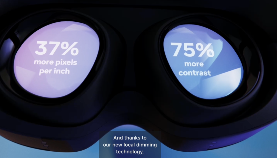 该设备搭载了高通升级版的XR2芯片平台XR2+Gen 1,采用了折叠光路Pancake光学方案,其显示区域相较于Quest 2薄了40%,但整机重量却达到了722g。并且,其LCD屏幕的PPI也比Quest 2高37%,对比度高75%。