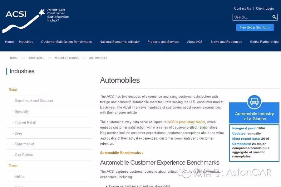美国消费者满意度指数(American Consumer Satisfaction Index)是质量和经济领域的热门话题,也是测量顾客满意程度的经济指标。ACSI覆盖49个行业的300多家公司,每年参与调查的消费者接近7万人,基于他们对产品的质量与服务进行评分。