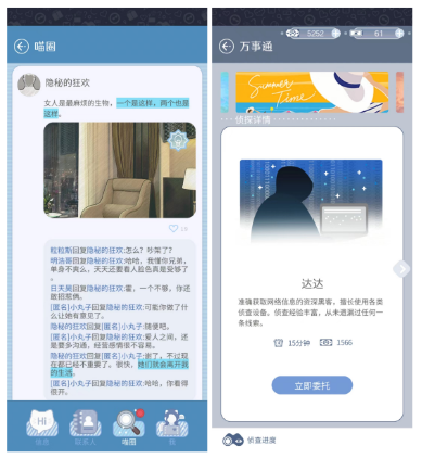 也是这种女性议题,让游戏剧情视角十分新颖,体验也非常有代入感。贴近生活的对话很像是“步步为营”,推测对方真实意图的同时,能感受到自己的情绪在流动。用匿名身份在朋友圈窥探秘密、委托侦探调查、偷听,在周旋于身边的各色人等中判断敌我,无一不烘托出“心跳感”。