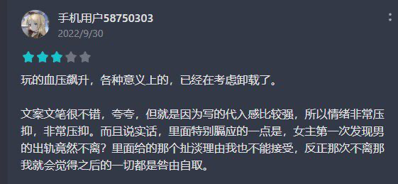 而对题材不感冒的玩家则如是说:相较于奇幻剧情的不确定,现实题材后续的剧情走向没太大悬念,让她兴趣寥寥。