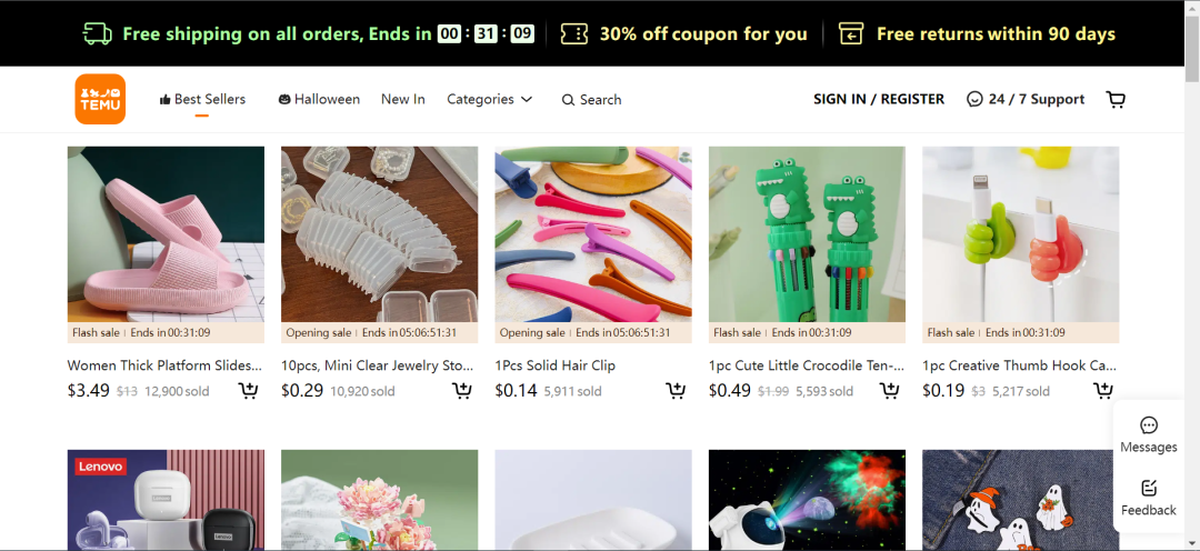 据了解,在Temu平台首页上,女士厚底拖鞋及透明首饰盒(10个装)销量最好,分别为12900单、10920单,价格分别为3.49美元、0.29美元。除此之外,消费者还可享受免邮费、7折优惠、90天内免费退货等福利。
