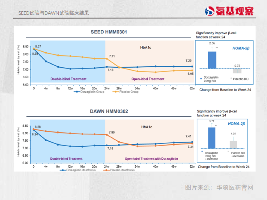 先来看一项华领医药开展的名为SEED的三期临床研究结果。这项研究入组了463名平均糖尿病患病史1年,且没有接受过糖尿病药药物治疗的患者。