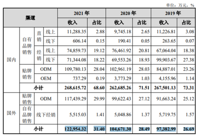 报告期内,其ODM模式下的销售收入及占比不断提升,而毛利率相对较高的直销、经销模式的销售收入却在逐年减少,最终发展为目前以ODM为主,经销模式为辅的销售模式。各期内,公司ODM销售收入已分别达17.66亿元、20.26亿元和22.72亿元,占公司主业收入的比例分别达48.39%、55.15%和 58.03%。