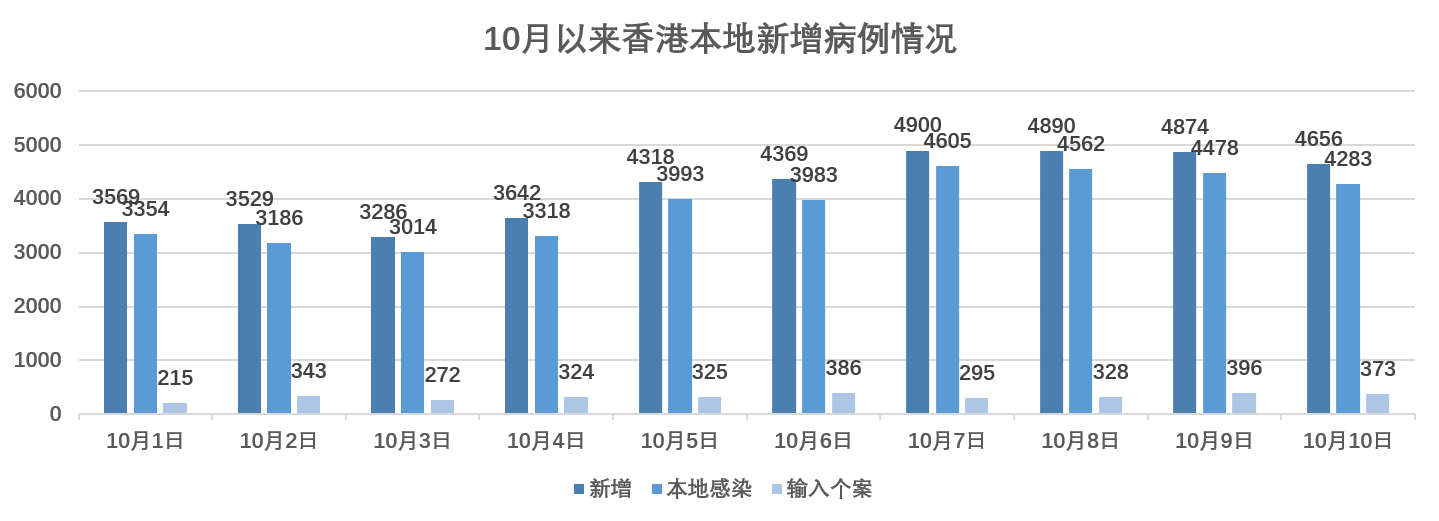 随着外来人员的增加,本地新增病例也呈回升状态。自10月5日以来,香港新增病例已经连续6天突破4000例。