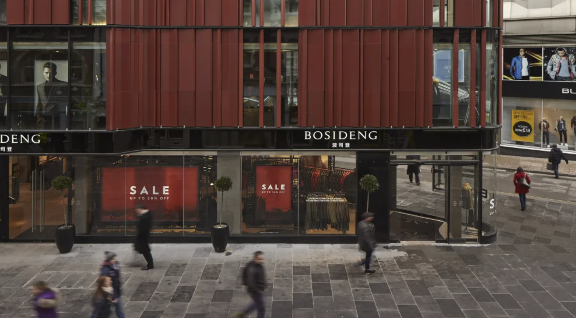 此前为了开拓英国市场,波司登在伦敦店的装修中将翅膀标志和拼音放大,汉字则被缩小。而在重装过后的新店外立面上,只在入口处才能看到拼音拼写的“BOSIDENG”,更高的墙面上挂着数个硕大的汉字“波司登”。