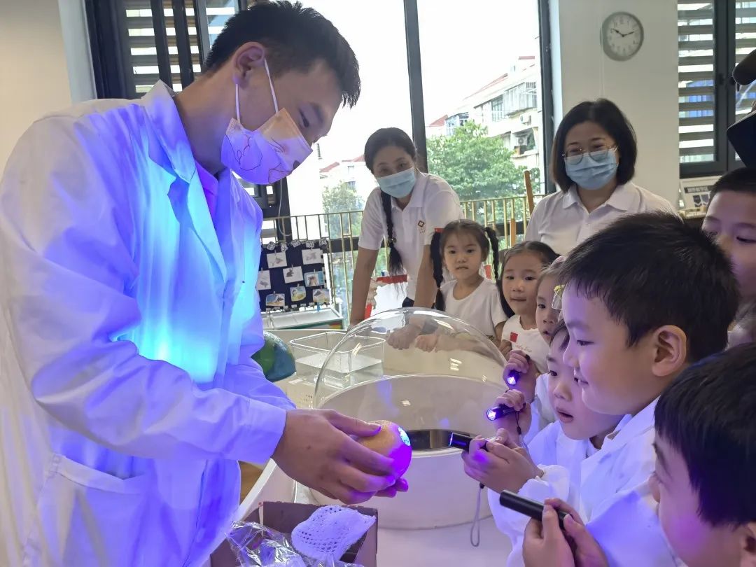 疾控工作专业性强,为了让小朋友们更好地理解细菌的概念,工作人员特地设计了一个紫光灯小实验:通过紫光灯照射生梨表面,让小朋友们看到梨子表皮上呈现的一个个圆形斑块,由此告诉他们“细菌”的概念,并教育大家吃水果前一定要洗一洗。中午午饭时间,小朋友们还在大厨的带领下来到食堂,了解食品安全知识,学习怎么看食品保质期。