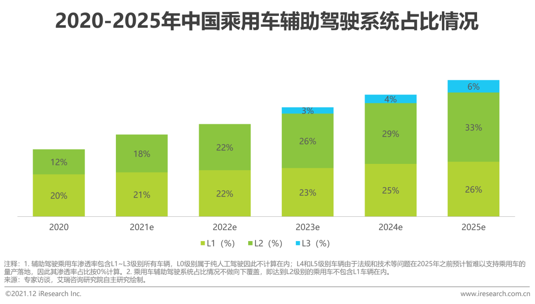 同时,国内市场在自动辅助驾驶方面更还是早期阶段,据官方统计现实,2021年乘用车辅助驾驶系统渗透率约37%左右,其中L1占比21%,L2占比达到18%。在L2级别渗透率还没有达到50%的阶段,谈L3级乃至L5级大规模落地仍然为时尚早。业内普遍认为到2030年之前,L3以上的辅助驾驶也最多只是刚开始进入市场。