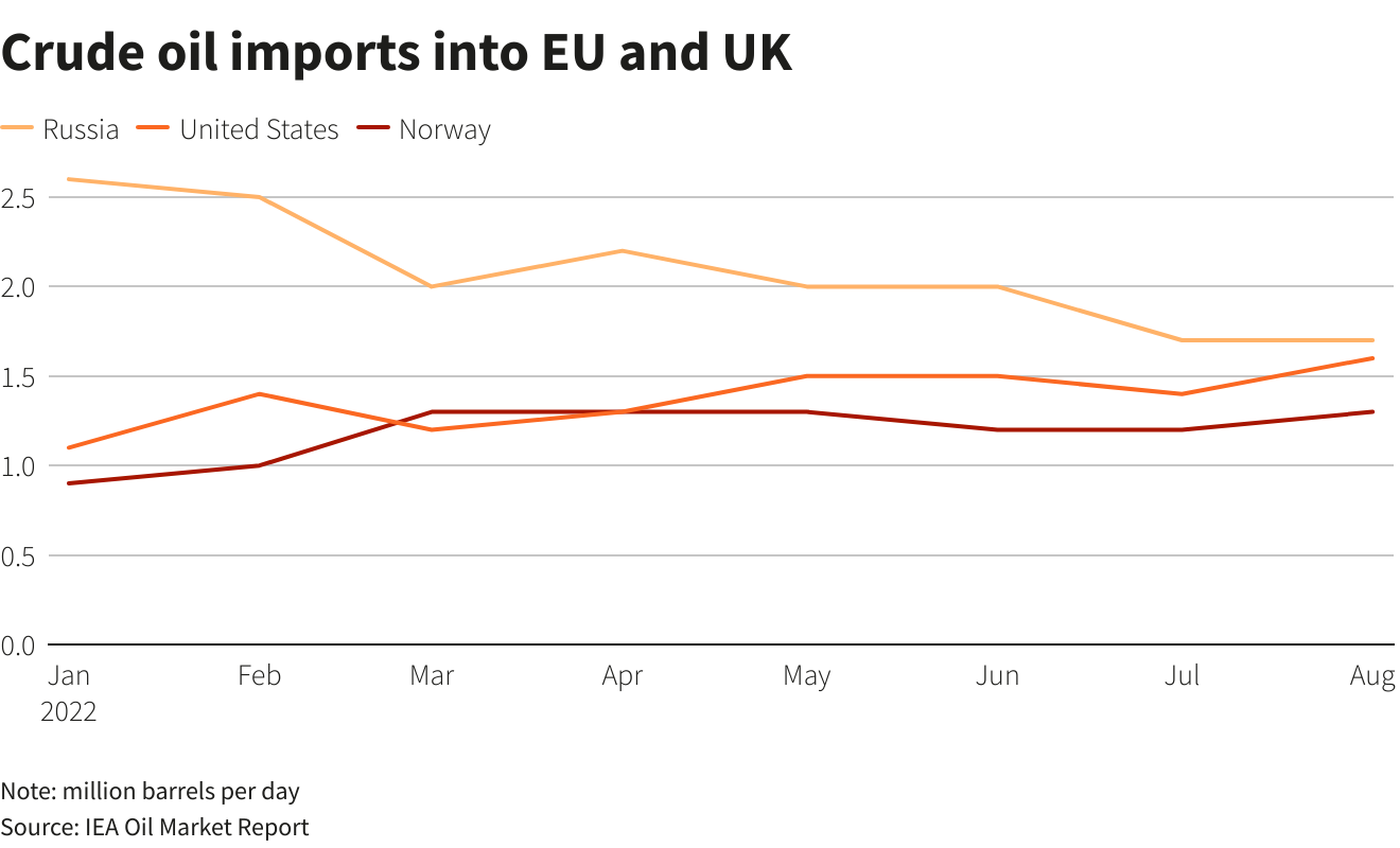 国际能源署(IEA)数据显示,去年欧洲平每天从俄罗斯进口220万桶原油。由于俄乌冲突等原因,8月俄罗斯对欧盟和英国的原油出口量,从1月的260万桶/日下降35%,至170万桶/日。