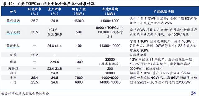 而到了2022年,组件端一体化龙头企业已陆续对 TOPCon 启动大规模的投产和扩产行动,标志着N型技术电池进入规模化量产“元年”。