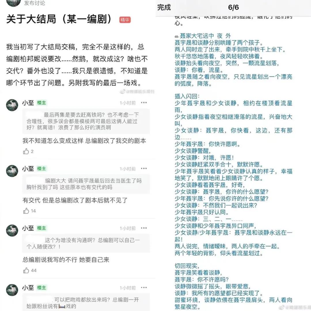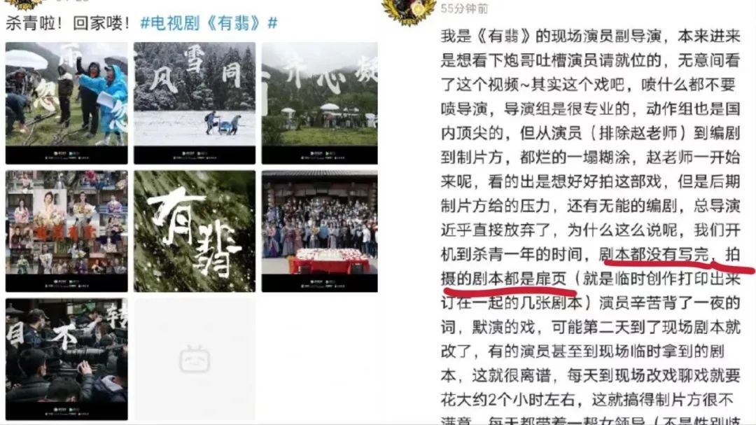说来有意思,随着自媒体发达、观众日益“专业化”,越来越多幕后人员来到台前(《编剧起义》)。于是,国产剧每次一被骂烂尾,这类“卖惨”解释的小作文便会浮出水面。