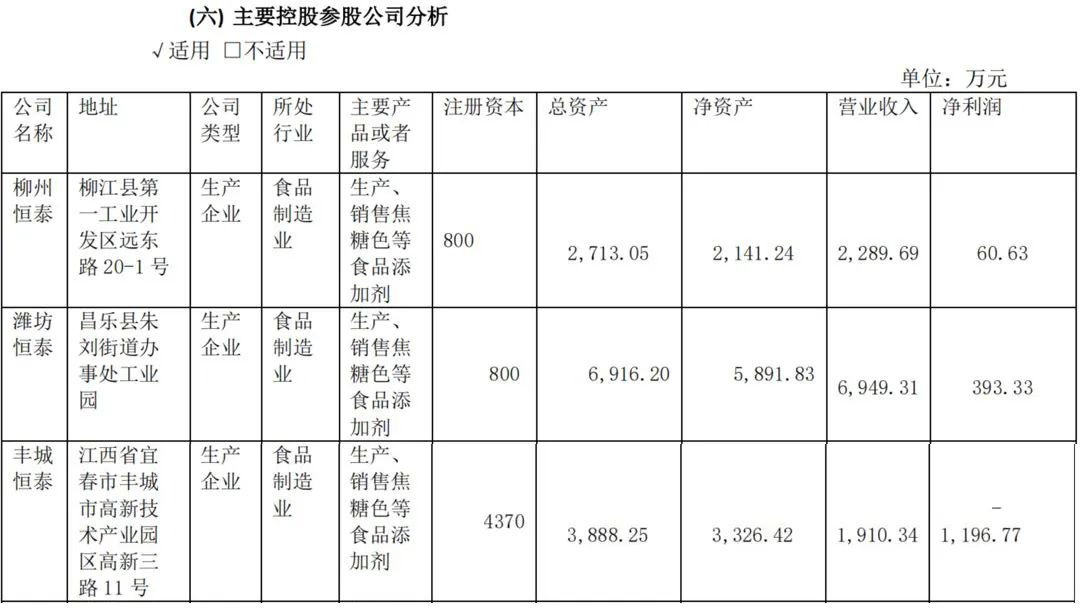 千禾味业在其财报中并未披露焦糖色的产销量。但其2022半年报显示,集团旗下五家子公司中,有三家从事焦糖色等食品添加剂产品生产,分别是柳州恒泰、潍坊恒泰和丰城恒泰。