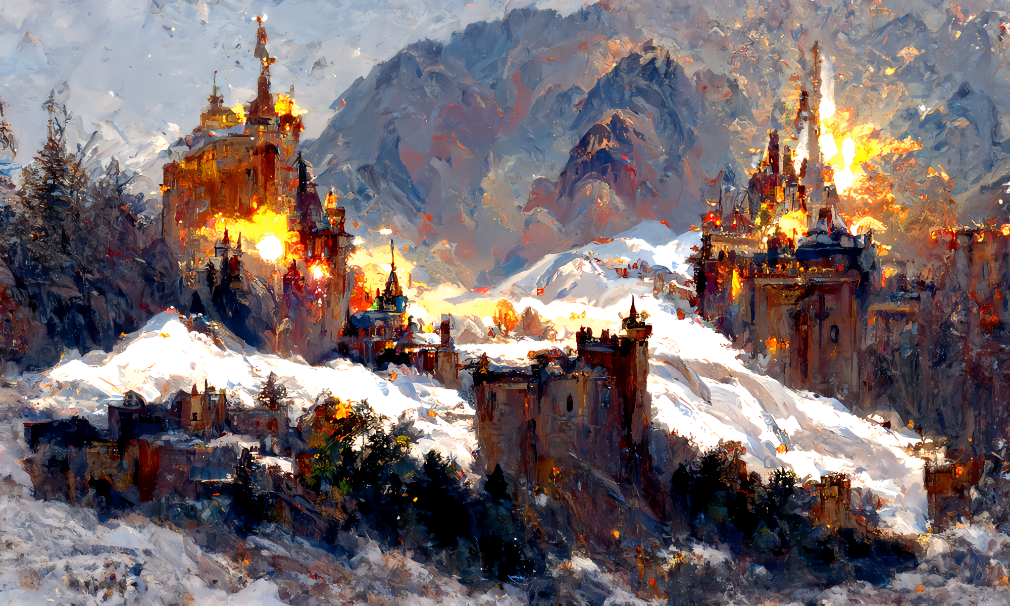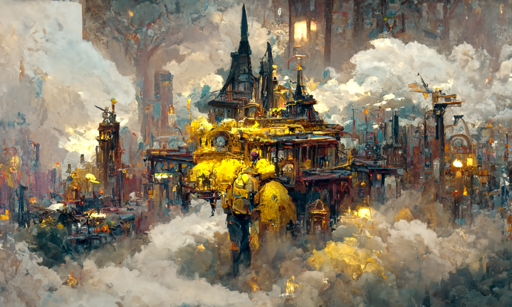 关键词:"结合greg rutkowski 和 thomas kinkade画风的一座宏伟而神奇的蒸汽城市"
