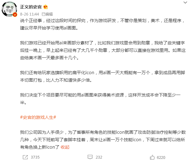 任职于某游戏公司的网友@正义的史官 发布微博表示,他们公司已经用上了AI作画制作游戏icon、美术参考图,还建议研发人员应该尽早开始学习使用AI画图。