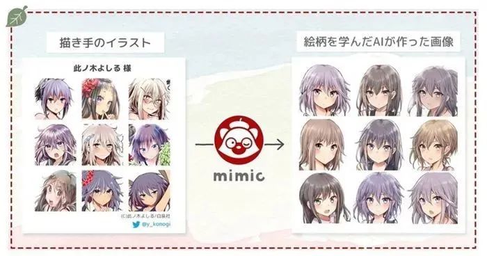 8月29日,专攻日系二次元画风头像的AI绘画网站mimic上线测试版,用户可以在该平台上传图像,并在AI完成学习后获得相同画风的AI画作。但是在测试的第二天,该平台就因为受到大量画师的抵制而不得不宣布暂时停止测试。