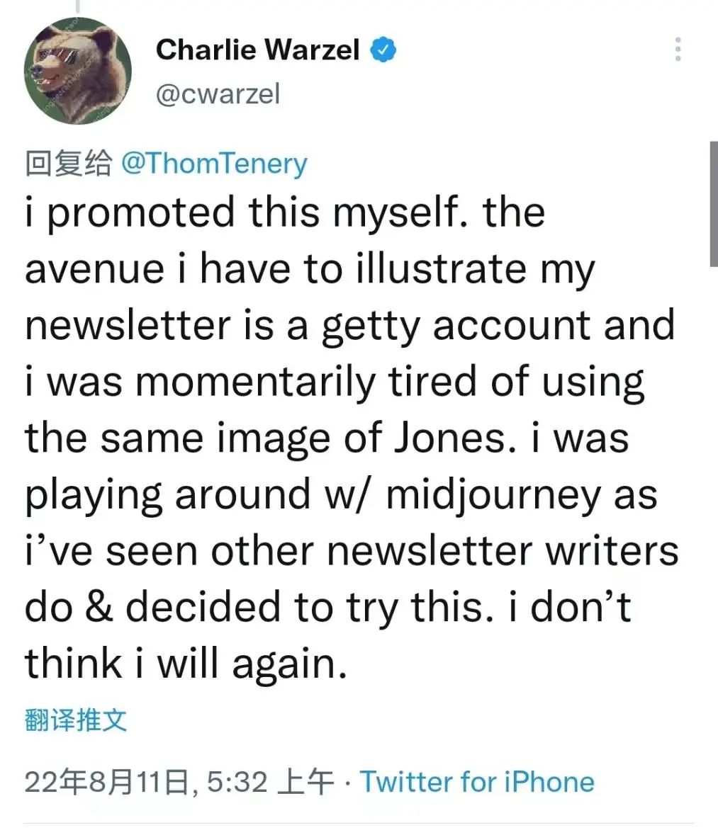 同月,美国《大西洋月刊》记者查理·沃兹因为在给自己的一篇文章中,使用了一张Midjourney绘制的图片的作为插画,引起了大量插画师的抗议。