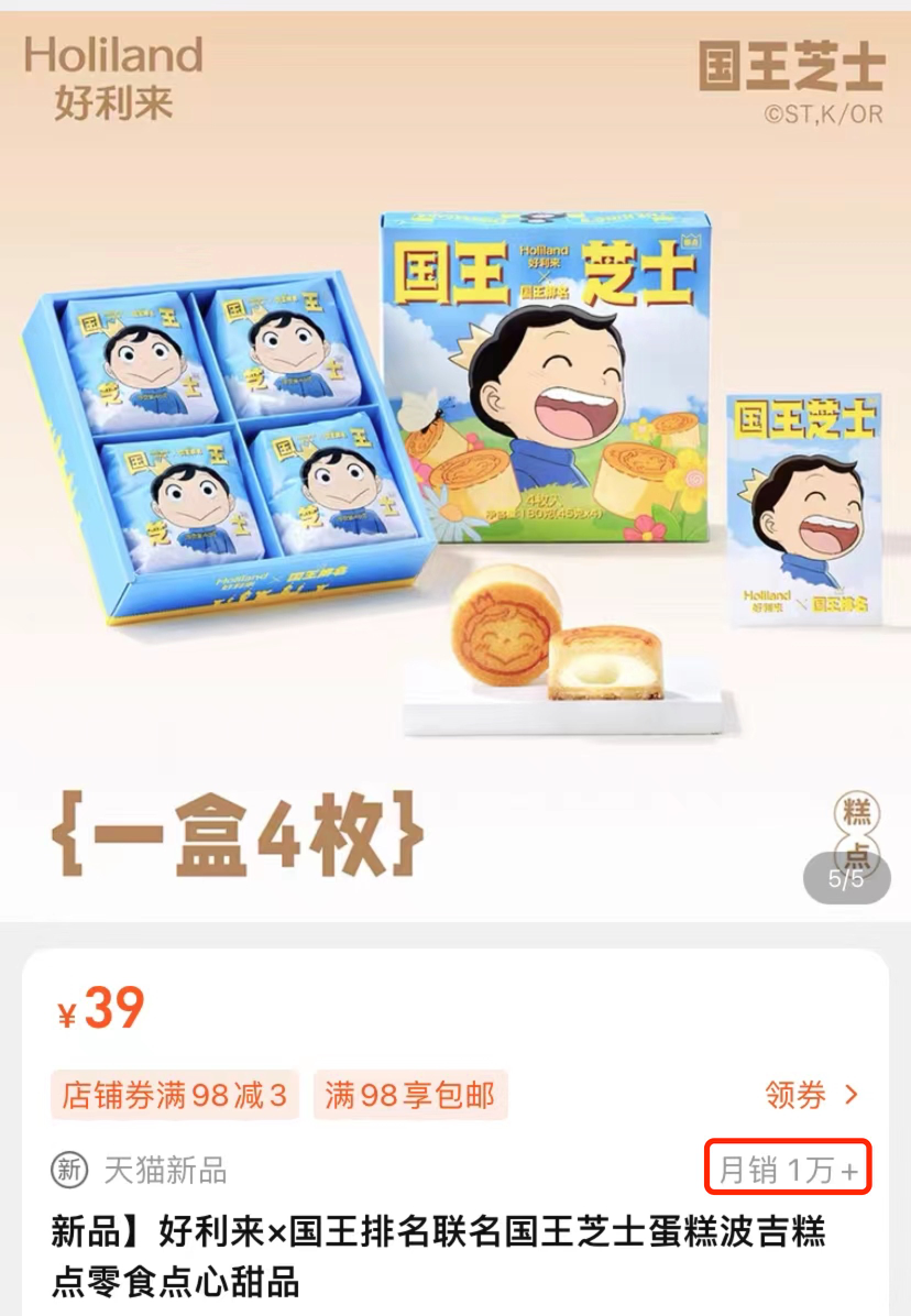 在好利来天猫的官方旗舰店,8月上市的国王排名联名款芝士蛋糕目前销量仍居前位,月销1万+,单价39元,其与LINE FRIENDS的经典联名款糕点,单价32元,月销2万+,月销上万的还有哈利波特的联名产品,售价几百元的草莓熊、三丽鸥、奥特曼蛋糕,单月销量也达到上千件。