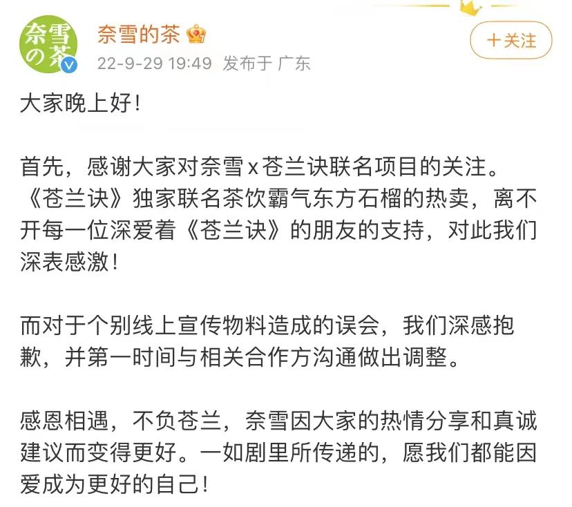 除了设计,IP联名活动在设置,权益等方面处理不当也容易引发粉丝不满,在联名活动的博文评论区,经常能够看到粉丝的“声讨”,如前段时间奈雪的茶因在战绩海报中仅提及男主角色,而引发女主粉丝的极大不满,连带制片人也被卷入争议的漩涡,后奈雪删除了该条微博,并进行了道歉。