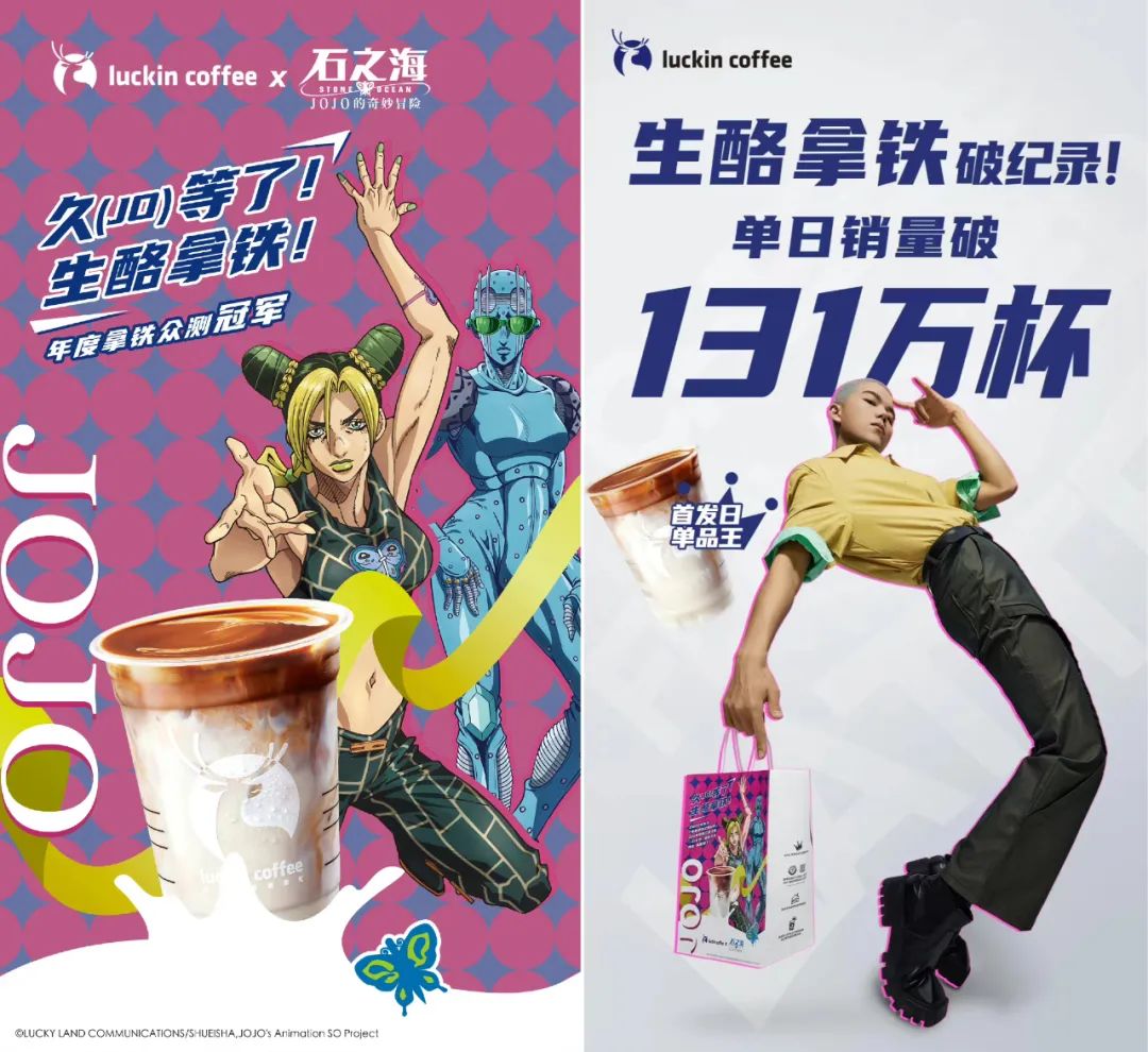 最近,“联名”产品又出圈。10月10日,国内连锁咖啡品牌“瑞幸”与日本知名动漫IP《JOJO的奇妙冒险》的联名咖啡一经上市便受到热捧,单日销量突破131万杯,按小程序20元的单价进行计算,销售额达2600多万,而这仅是其首天的成绩。4月瑞幸与椰汁品牌椰树联名的椰云拿铁同样出圈,但首发日的销量才66万杯,约为“JOJO”产品的一半。IP的“魅力”有目共睹。