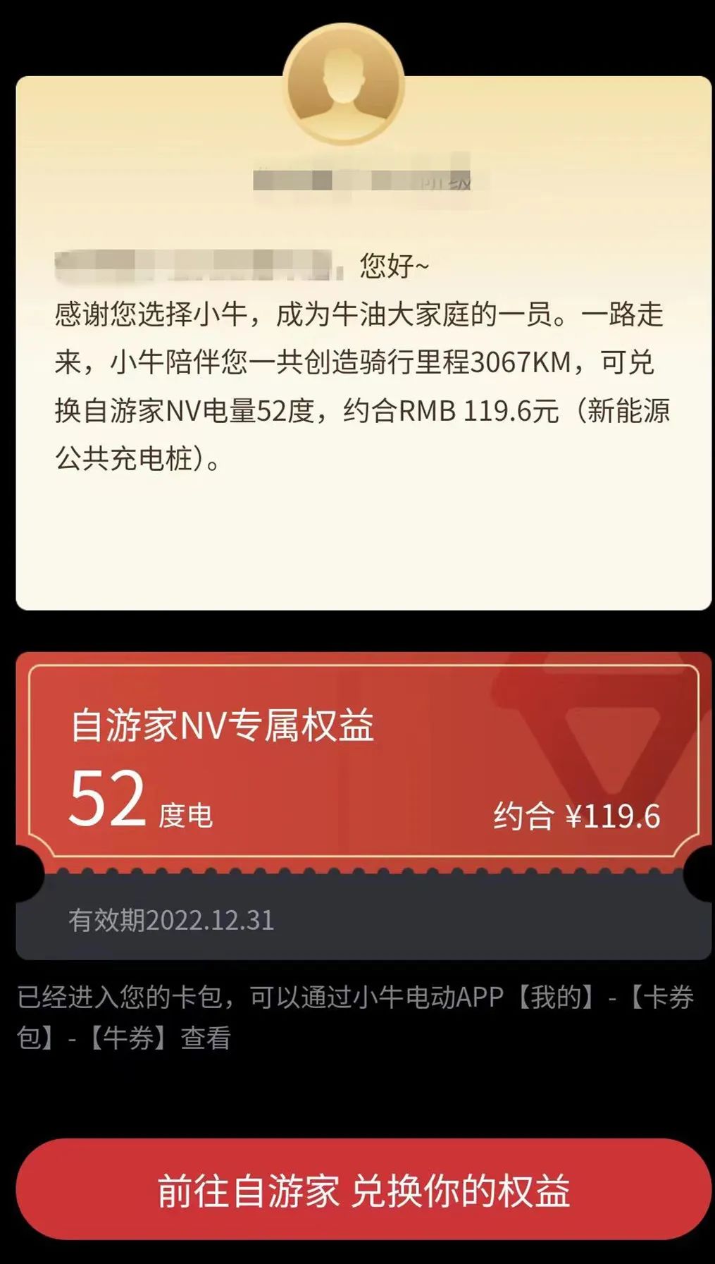 在搞清楚自游家NV是一款什么样的车后,黎维发现自己骑了3067公里的小牛电动车可以兑换52度(APP里描述约合119.6元)的新能源汽车充电电量。他点击进入详情页面后发现,并没有权益兑换的页面,直接链接到了自游家的官网。