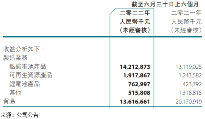 按收入划分,天能动力有两大板块,分别是制造业业务,以及新能源材料贸易业务。