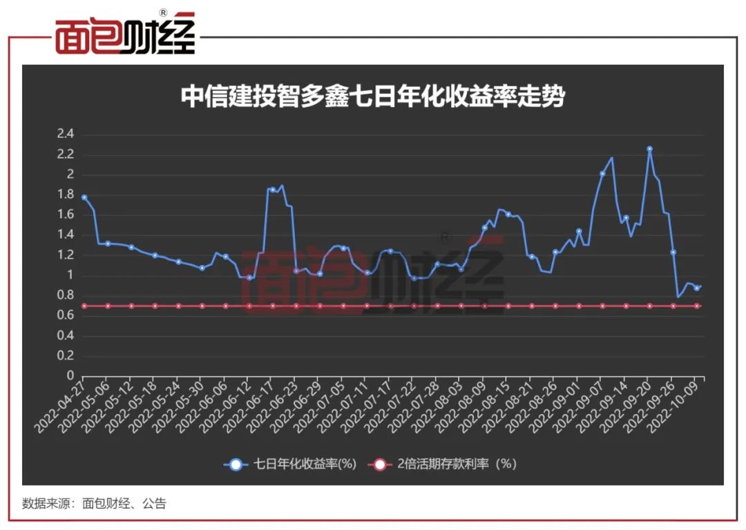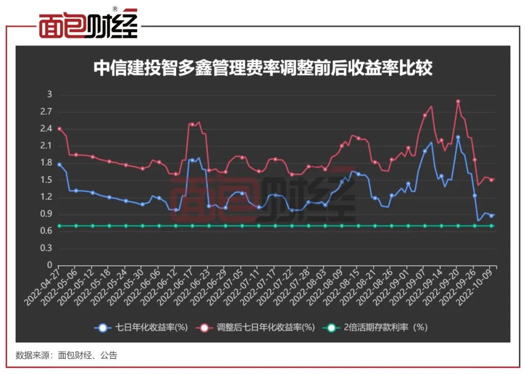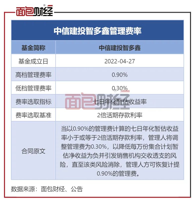 即便业绩排名靠后,中信建投智多鑫因七日年化收益率均维持在2倍活期存款利率(约0.7%)以上,2022年上半年仍然按照浮动费率的高档,即0.9%向投资者收取管理费。