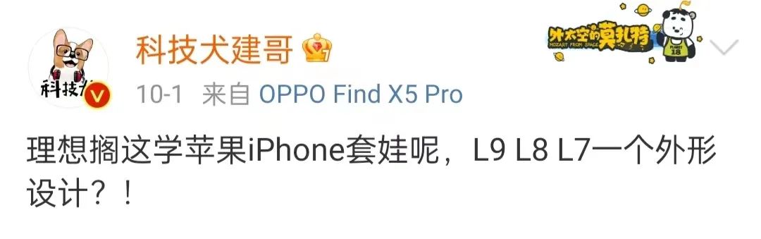 理想创始人李想,此前曾在微博上表示,L9就是iPhone 14 Pro Max,而L8是iPhone 14 Pro。