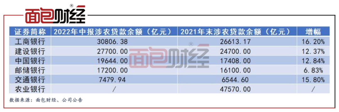 财报显示,披露数据的五大行中,2022年6月末,涉农贷款在总贷款中占比最高的是邮储银行,达到24.6%。农行2021年末占比为27.76%,略高于邮储银行。