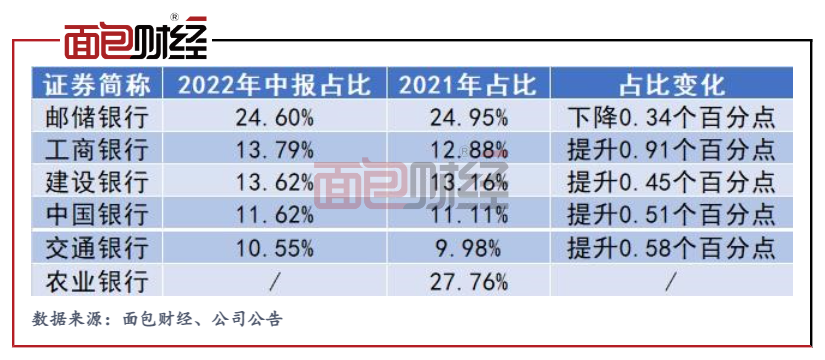从占比变化来看,除农行数据缺失、邮储银行占比下降0.34个百分点外,其他国有行2022年上半年占比均有所提升。其中,工商银行2022年上半年占比较上年上升0.91个百分点,增幅最高。