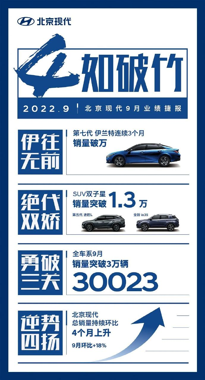 公开数据显示:整个9月,北京现代共销售新车30023辆,环比增长18%。其中,第七代伊兰特上月销售破万,达成连续三个月销量破万记录;途胜L和ix35合力贡献销量超13000辆;而被寄予厚望的库斯途等车型销量相当惨淡。