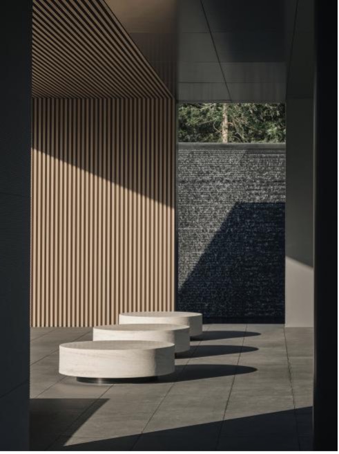 穿过景墙,一切成极简之势展开,柱子、格栅、水幕,以及30°斜角的水流,在天光云影的变幻中,静谧自现。