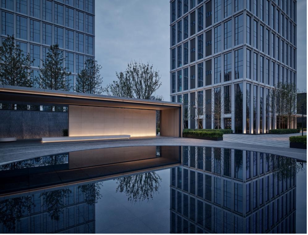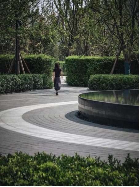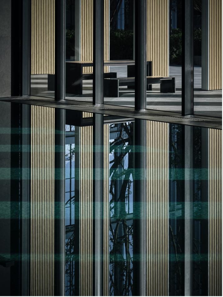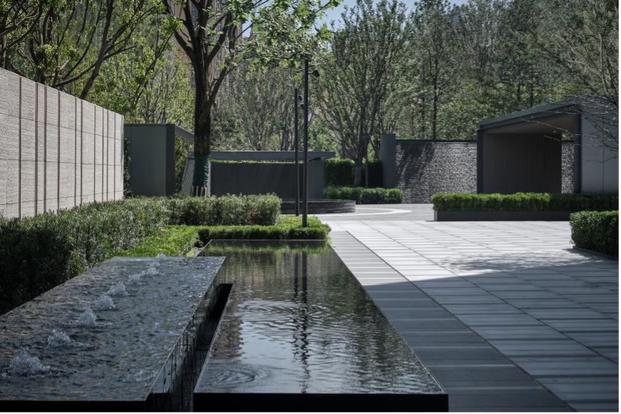 双层叠水与景墙交错,又有涌泉,用静谧与灵动营造出韵律感,建筑与植物倒映于安静的水面中,从视觉上强化竖向层次,这是前庭。