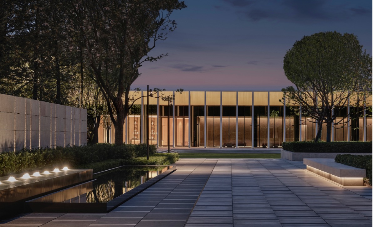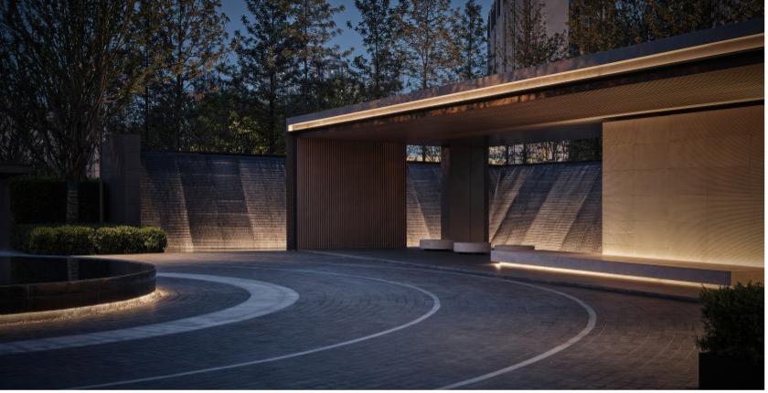 大门徐徐开启,如画卷般打开,叠水广场映入眼帘,超600平米的落客区,中⼼设圆形溢水水景,与主入口廊架交相呼应,用几何形体表达关系,形成蒙德里安的艺术记忆。