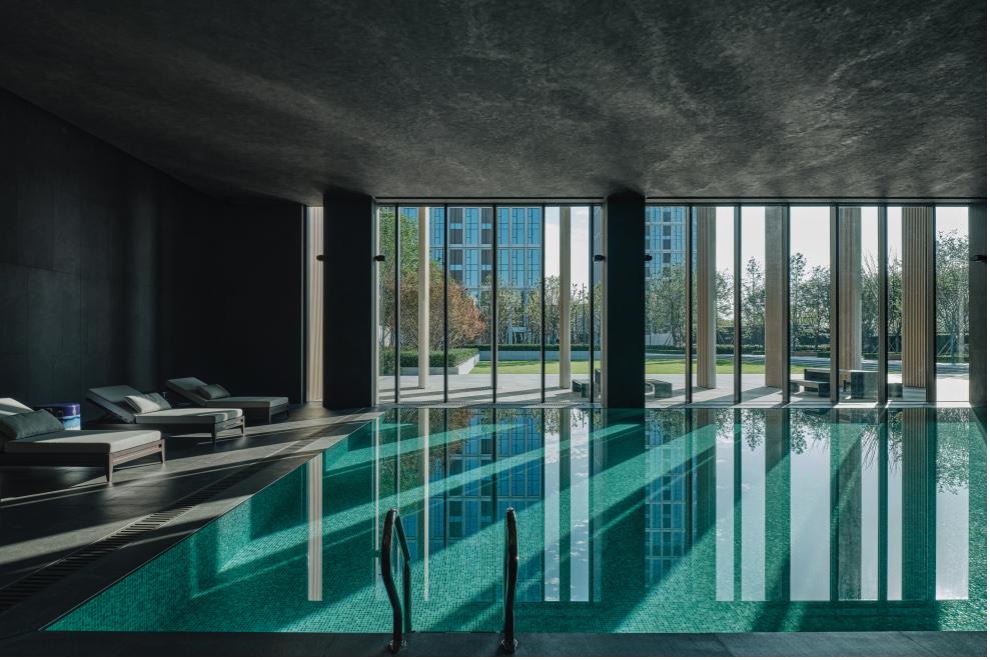 泳池会所的室内设计呼应建筑设计元素。除运用线条和光影效果营造现代美感外,没有多余的构饰影响极致美态,那一片落地窗便是最大的风景。依附于窗外绝美的景观,设计传达出最本质和纯粹的存在意义。