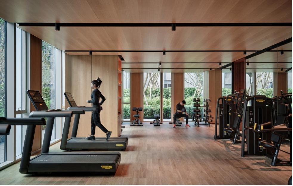 大堂书吧、健身中心,空间设计语言延续了建筑立面蒙德里安式的构成手法。洋溢其间的秩序感和仪式感,与全方位的服务形成了巧妙的联动。