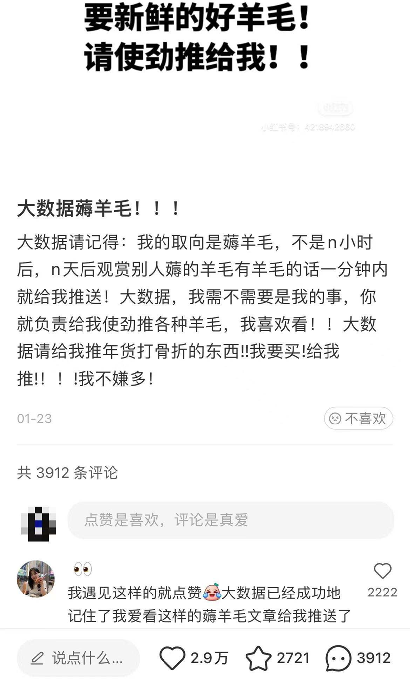 从“一天十几个快递,老公问我都买了什么,实际只有6包卫生纸两把牙刷,试用装洗发水和百洁布”的描述中可以看出,小红书的羊毛用户更像是在完成一种自我挑战。