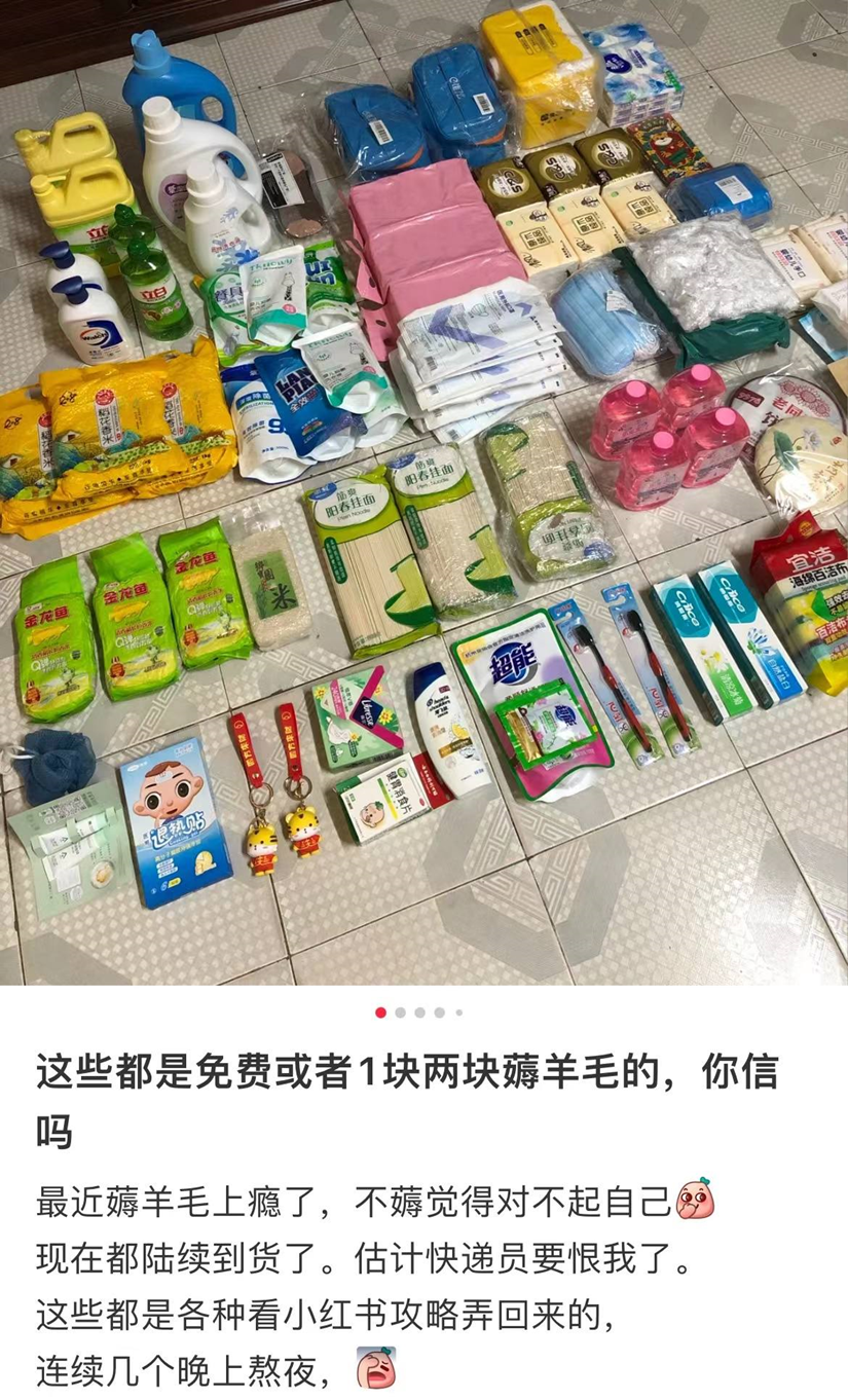 即便是小红书名媛,也同样会把纸抽、牙刷、塑料药箱和洗洁精,视作一名羊毛用户的功勋章。
