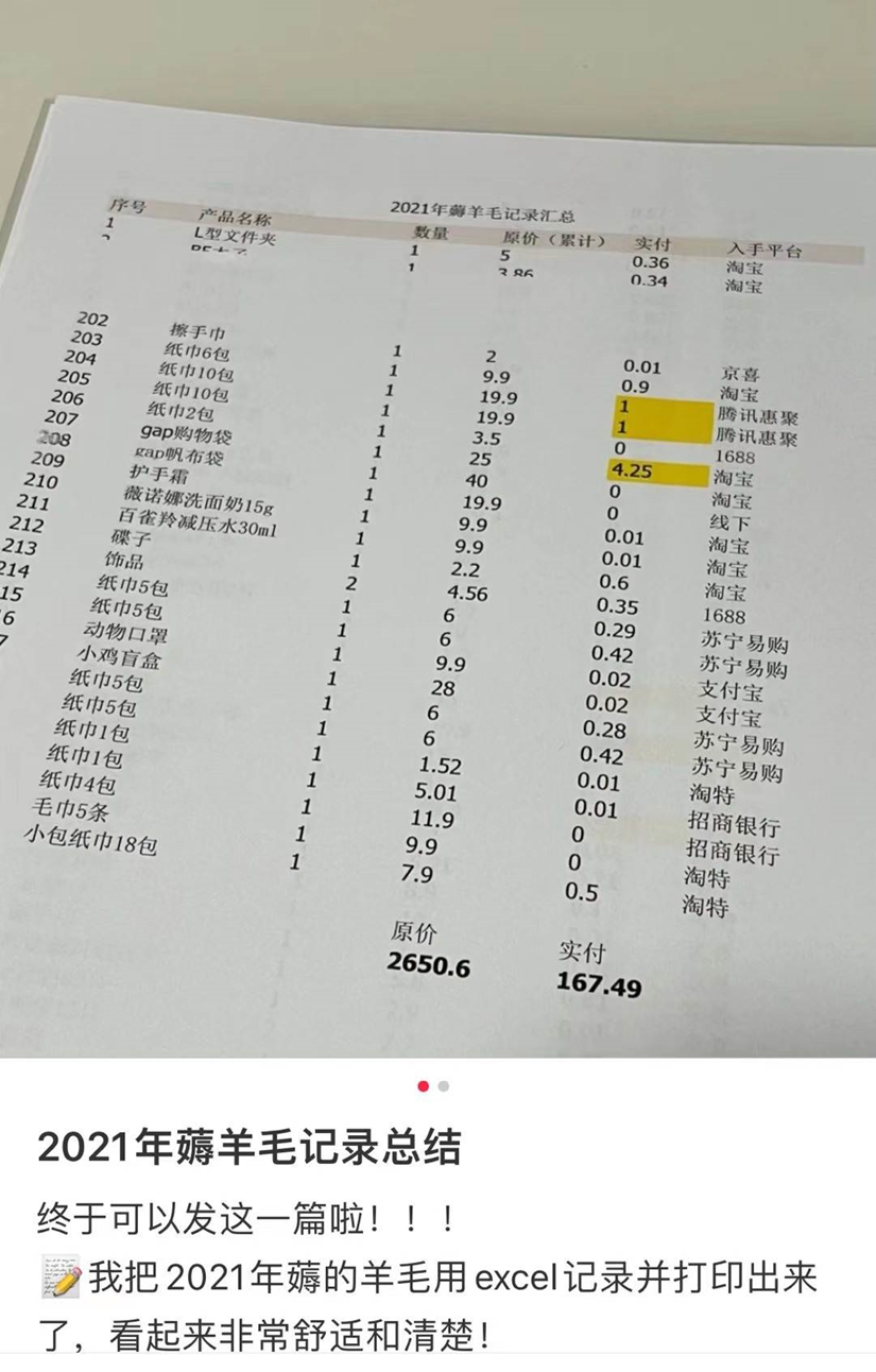 博主讲述经验,围观者分享心得,有人甚至会在网上发布薅羊毛一点的年度总结,我们能清楚看到这一年里只花200块钱,能给人放大多少快乐。