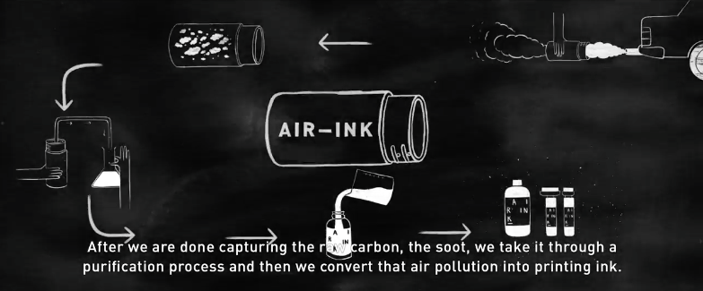 实验室联合创始人Anirudh Sharma是个关心环境问题的印度技术男,几十年来,亚洲的经济发展与人口增长带来环境问题中,空气污染是对人类健康最大的威胁,Anirudh想用技术和创意的结合带来一些改变。他发明了一个碳类污染排放物收集器,然后跑到香港和印度收集卡车、轮渡、烟囱、起重机等柴油排放物,最终经过实验室提纯、净化,Air-Ink墨水就此诞生。