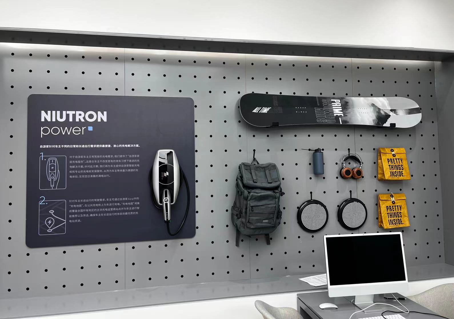 随后,界面新闻又对位于凤凰汇购物中心的自游家永久展厅进行了探访。展厅位于商城一层的角落处,由于面积过于狭小,展厅内只对选配部件、充电桩、车漆颜色以及部分周边产品进行了陈列展示。